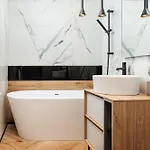 - ❓Welche Ausstattung bieten Badezimmer in des Apartments Cosmopolit Booking?Das Apartment Cosmopolit Booking verfügt über Badezimmer, ausgestattet mit einem Haartrockner, kostenlosen Toilettenartikeln und Badelaken.